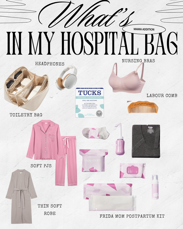 When it came to packing for myself, I wanted to feel prepared but not overpack. Every mama’s needs are different, but after talking with friends, doing research, and reflecting on what’s truly helpful in those first few days, I narrowed it down to these essentials. These are the items I feel will make me the most comfortable and supported as I recover and adjust to life with a newborn.